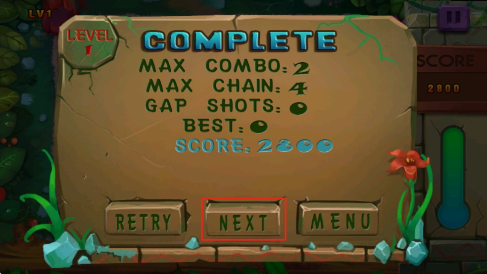 3、成功通關(guān)后界面會(huì)顯示本局的數(shù)據(jù),點(diǎn)擊NEXT按鈕即可進(jìn)入下一關(guān),挑戰(zhàn)更復(fù)雜的彩球布局與消除難度。