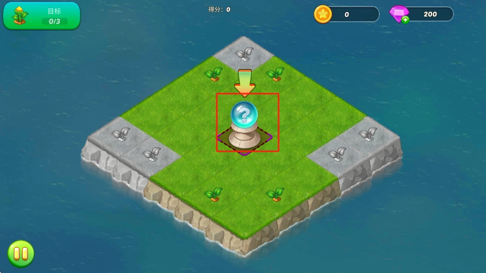 1、開局觀察島嶼上的藍(lán)色問號(hào)裝置,根據(jù)箭頭指引點(diǎn)擊,觸發(fā)其功能,助力植物種植,朝著目標(biāo)數(shù)量推進(jìn)。