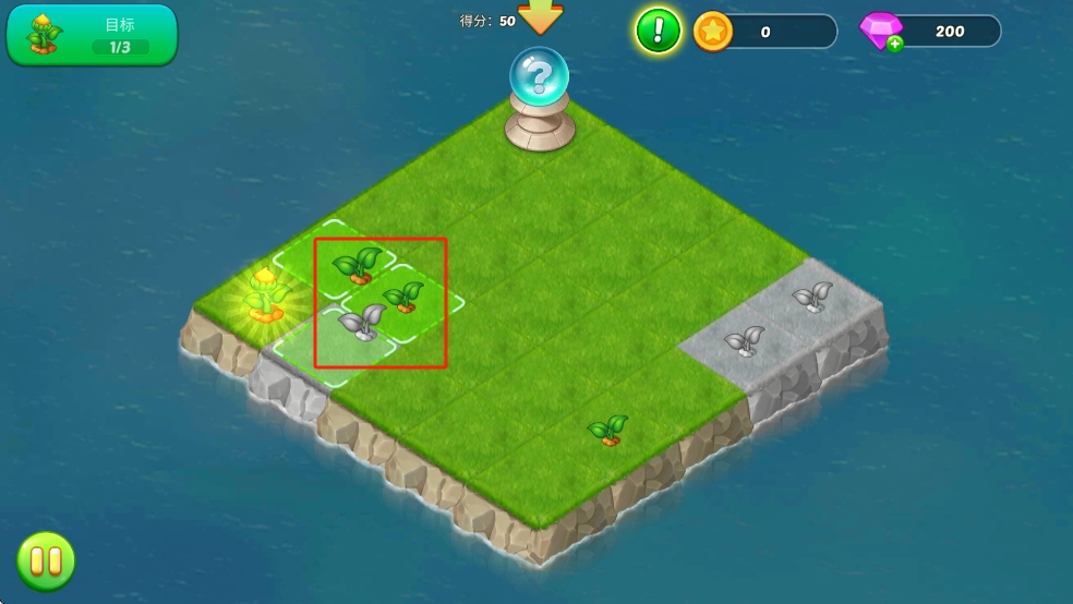 2、留意紅框內(nèi)的植物幼苗區(qū)域,及時(shí)點(diǎn)擊可種植或升級(jí)植物,利用島嶼空間合理布局,提升得分,完成目標(biāo)。