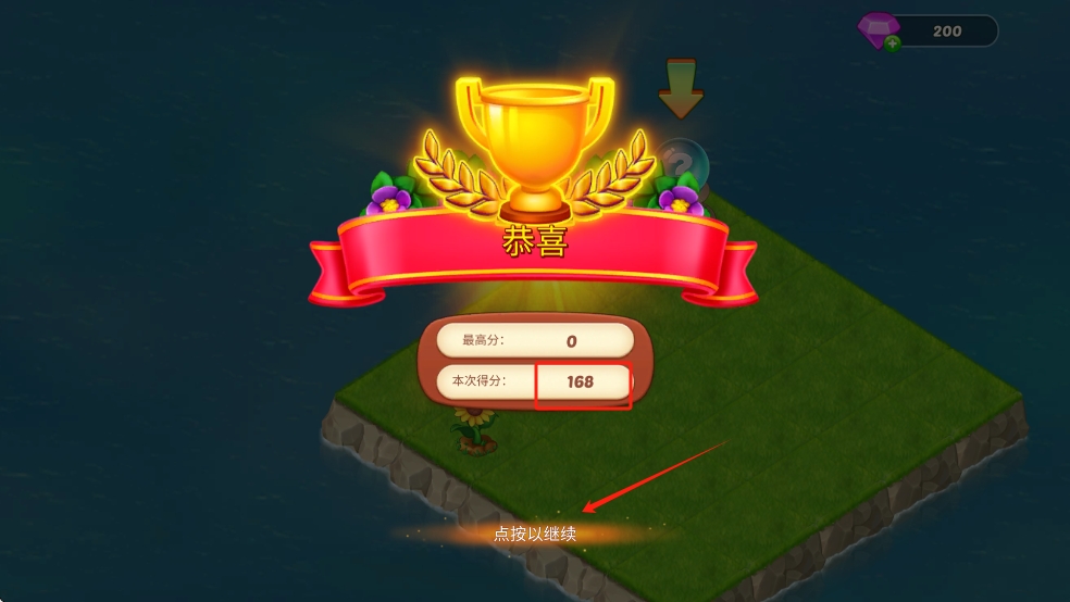 3、通關(guān)后,界面顯示本次得分168,點(diǎn)擊下方點(diǎn)按以繼續(xù)的按鈕,進(jìn)入下一環(huán)節(jié),可積累經(jīng)驗(yàn)優(yōu)化后續(xù)種植策略。