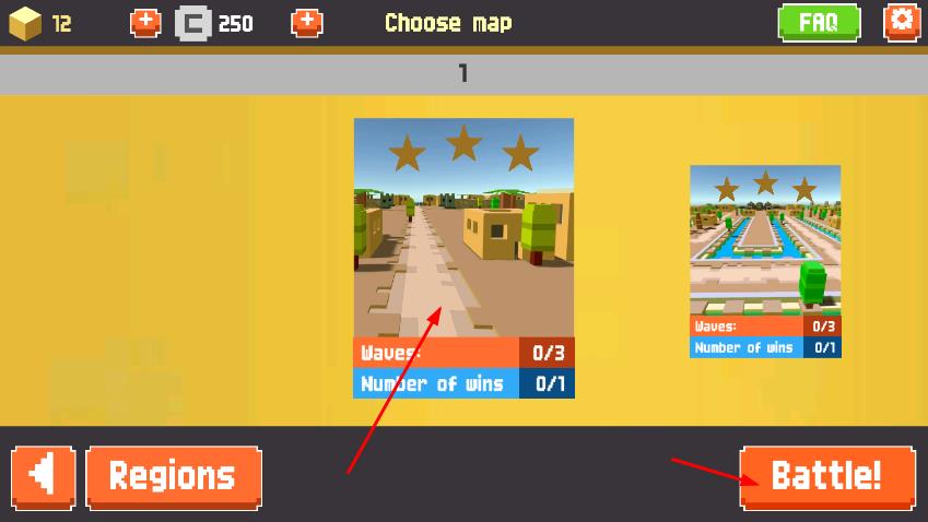 1、在地圖選擇界面,上方顯示擁有的方塊數(shù)量,貨幣數(shù)量,點(diǎn)擊想要挑戰(zhàn)的地圖,然后點(diǎn)擊Battle!按鈕開始戰(zhàn)斗。