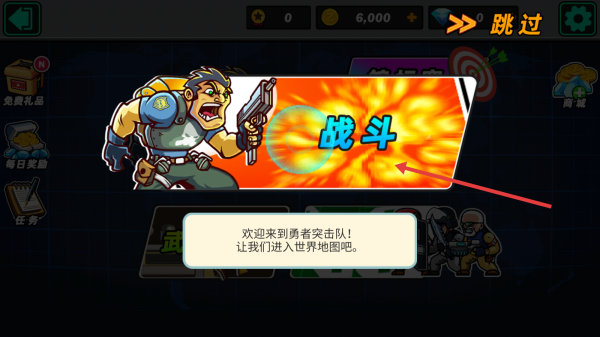 1、主界面點(diǎn)擊戰(zhàn)斗按鈕,進(jìn)入關(guān)卡選擇頁(yè),開(kāi)啟勇者突擊隊(duì)冒險(xiǎn),準(zhǔn)備投身第一場(chǎng)戰(zhàn)斗流程。