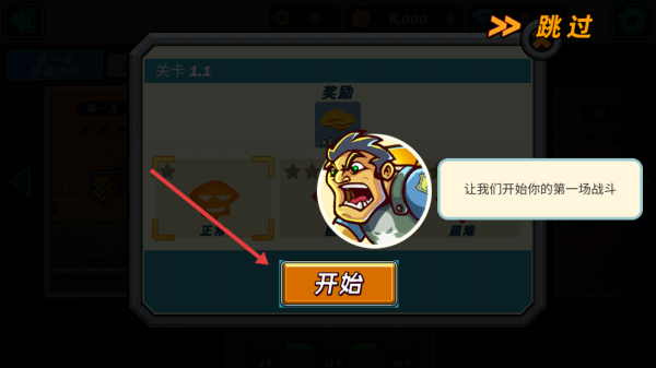 2、在關(guān)卡1.1界面,點(diǎn)擊橙色開(kāi)始按鈕,正式啟動(dòng)首場(chǎng)戰(zhàn)斗,按指引推進(jìn)對(duì)戰(zhàn)環(huán)節(jié)。