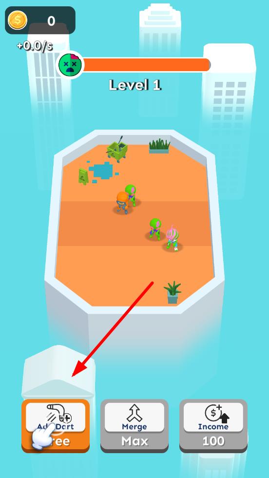 1、進(jìn)入游戲,在Level 1場地界面,點(diǎn)擊左下角Add Dart按鈕,向場內(nèi)投放基礎(chǔ)飛鏢,開啟首輪敵人抵御。