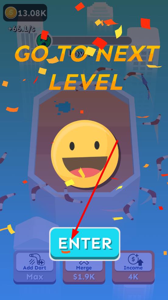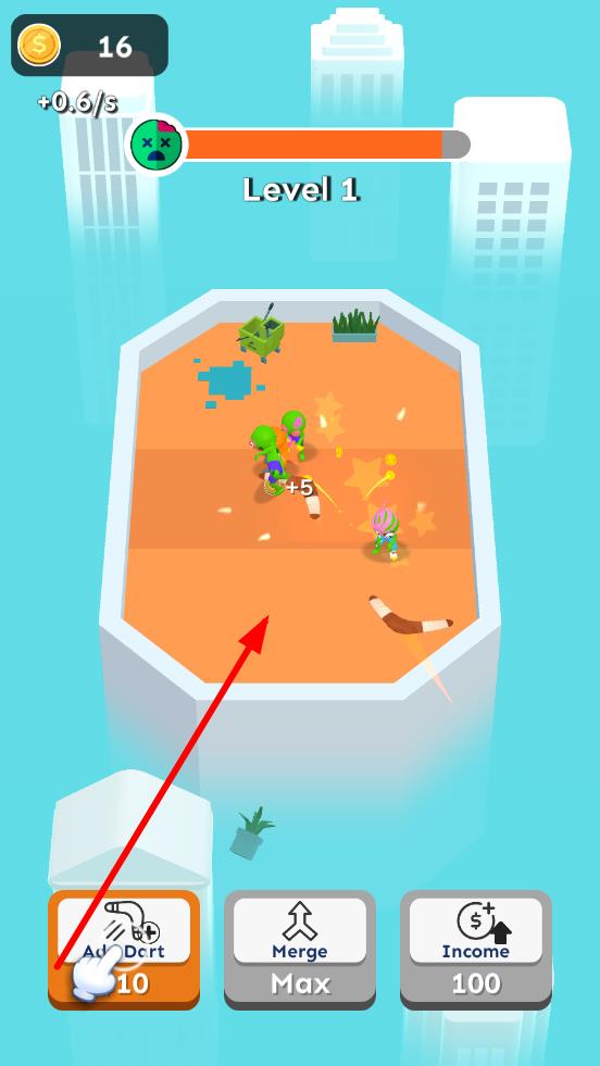 2、飛鏢自動(dòng)攻擊敵人獲取金幣,積累一定數(shù)量后,點(diǎn)擊Merge按鈕,將低級(jí)飛鏢合并為高階,強(qiáng)化輸出能力。