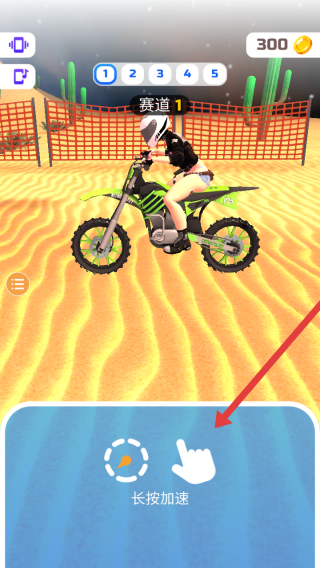 1、進(jìn)入賽道關(guān)卡1的游戲界面,需要長(zhǎng)按加速快速啟動(dòng)摩托車,開啟與對(duì)手的摩托車競(jìng)技。