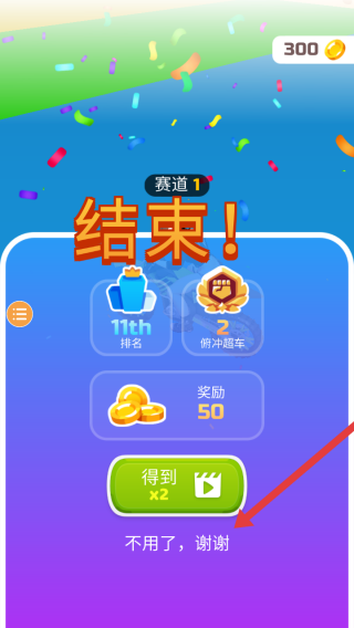 3、當(dāng)賽道關(guān)卡1結(jié)束后,可以選擇點(diǎn)擊不用了,謝謝,直接領(lǐng)取50金幣獎(jiǎng)勵(lì),跳過(guò)廣告翻倍。