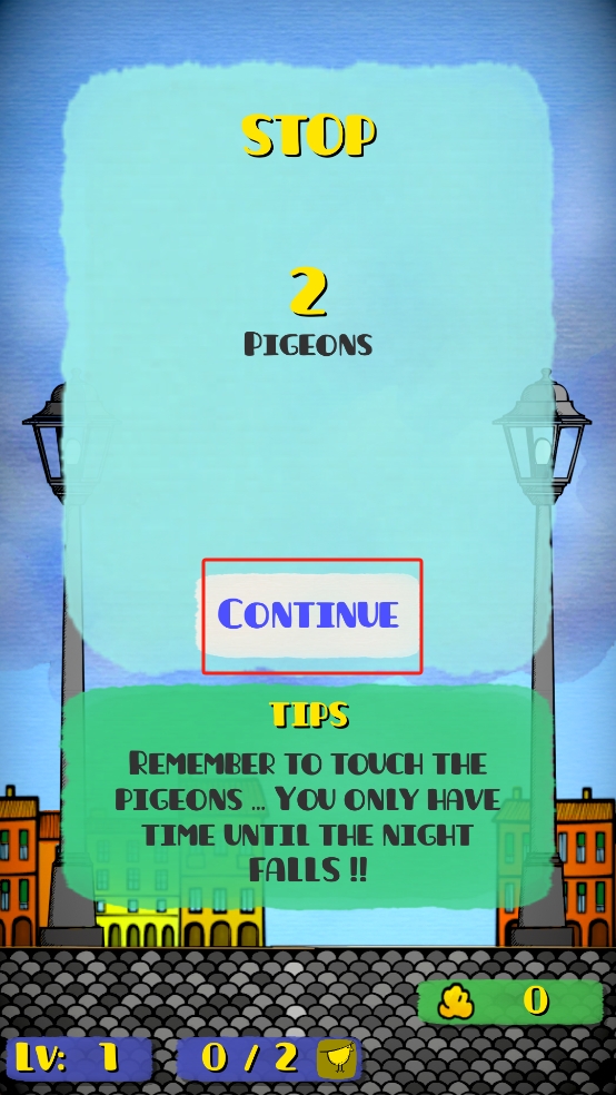 3、完成攔截后,界面會(huì)顯示本局的分?jǐn)?shù),點(diǎn)擊CONTINUE按鈕進(jìn)入下一階段,牢記提示,在天黑前攔截指定數(shù)量鴿子。