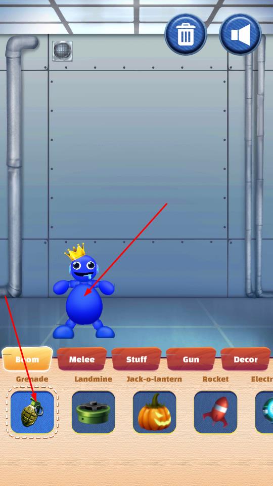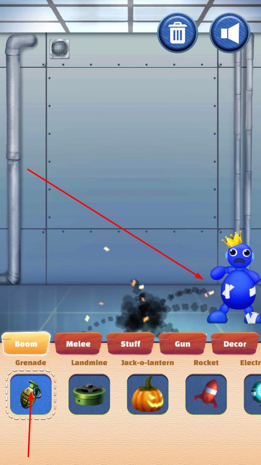 1、進(jìn)入游戲界面,在下方分類欄選Boom類道具,如點(diǎn)擊Grenade手雷,將其拖至藍(lán)色戴皇冠角色處,觸發(fā)互動(dòng)效果。
