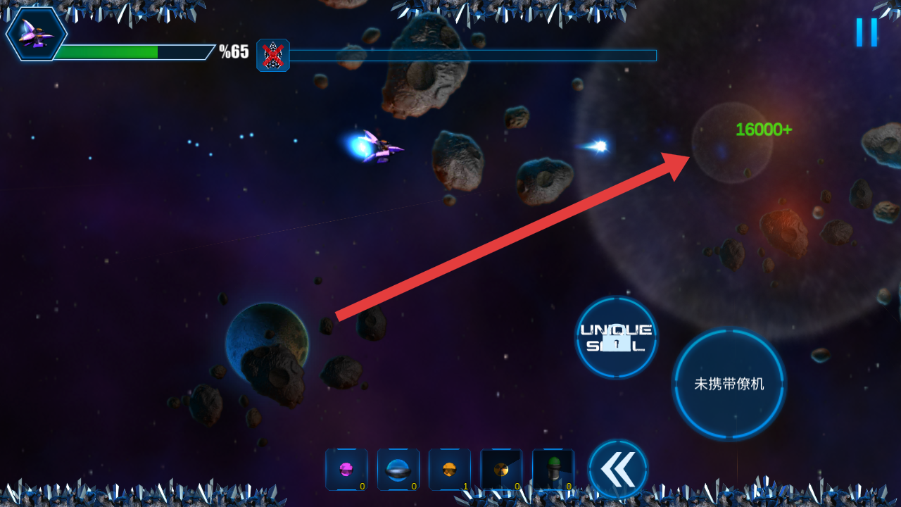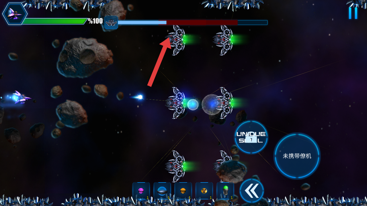 1、操控戰(zhàn)機(jī)瞄準(zhǔn)對(duì)面的全部敵方飛船,需要發(fā)射彈幕進(jìn)行攻擊,還需注意頭上的敵方血量條。
