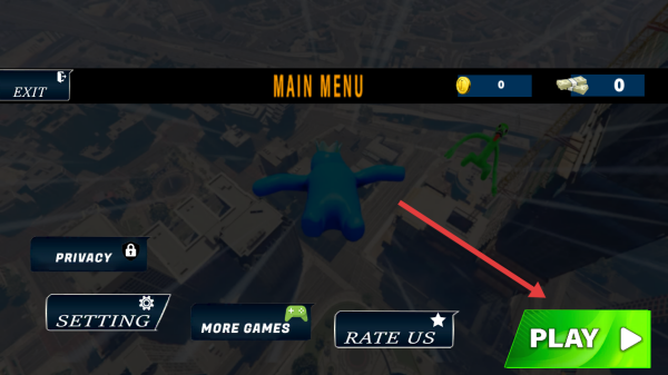 1、主菜單點擊綠色PLAY,進(jìn)入3D城市場景,操控藍(lán)色人形角色,開啟都市冒險流程。