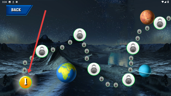 2、在星際地圖選關(guān)界面中,按照箭頭指向處點(diǎn)擊選擇解鎖的黃色星球1關(guān)卡,進(jìn)入第一關(guān)戰(zhàn)斗場景。