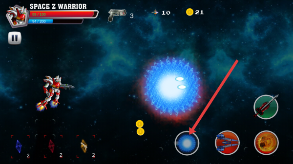 3、在戰(zhàn)斗中可以點(diǎn)擊右下角藍(lán)色技能圖標(biāo),釋放技能,助力機(jī)甲SPACE-Z-WARRIOR消滅敵人。