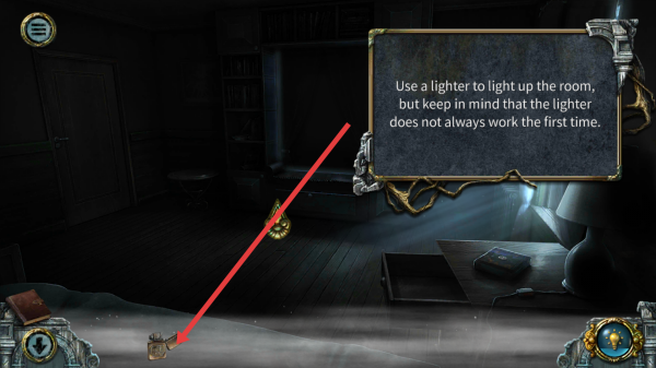 2、在黑暗房間按提示,點(diǎn)擊道具欄打火機(jī),多次嘗試直至成功點(diǎn)亮房間,獲取可見場(chǎng)景道具推進(jìn)流程。