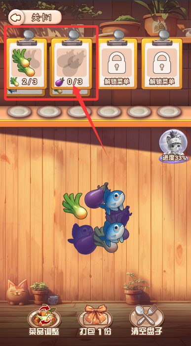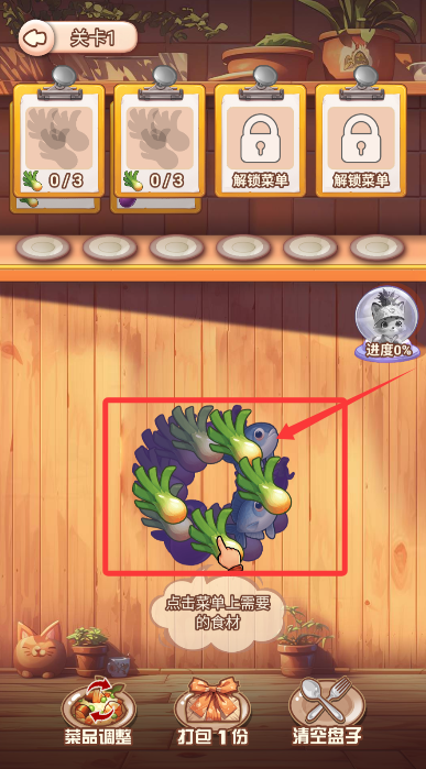 1、先查看頂部任務(wù)欄的食材需求,從底部的食材庫中挑選匹配的原料。