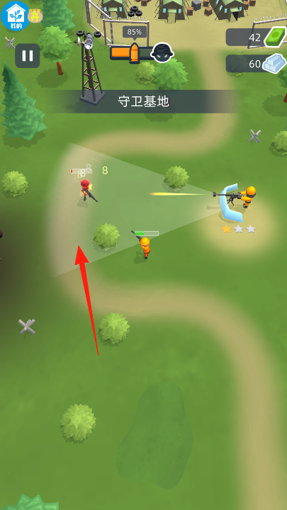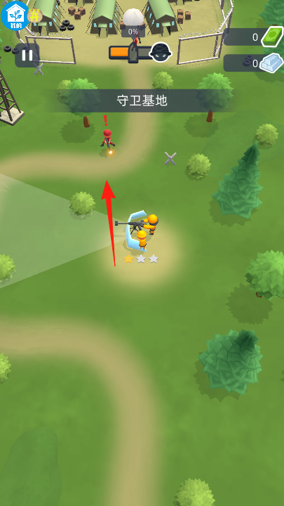 3、持續(xù)在敵人路徑布置單位,生產(chǎn)士兵,升級(jí)防御,當(dāng)敵人來(lái)襲,指揮士兵攔截、攻擊,守護(hù)基地血量,完成守衛(wèi)基地任務(wù)。