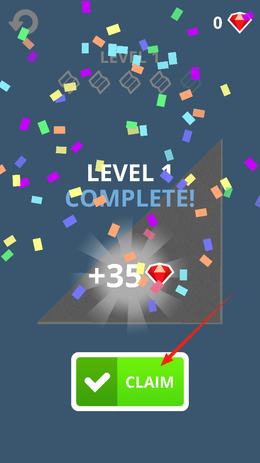 2、Level1完成后界面顯示Level1Complete,點(diǎn)擊綠色CLAIM按鈕領(lǐng)取35顆鉆石獎(jiǎng)勵(lì),該操作確認(rèn)關(guān)卡完成并獲取獎(jiǎng)勵(lì),解鎖進(jìn)入下一關(guān)的通道。