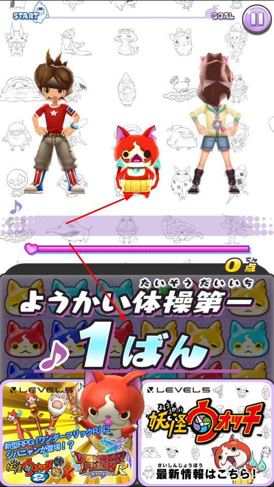 2、角色將伴隨音樂做體操動(dòng)作,同時(shí)操作下方拼圖區(qū)域,滑動(dòng)連接相同顏色的妖怪頭像進(jìn)行消除,積累分?jǐn)?shù)。