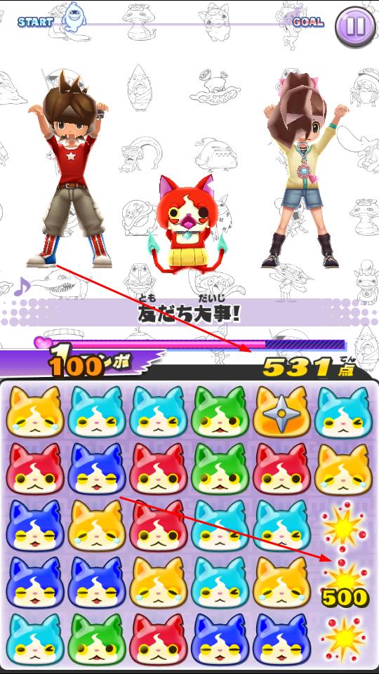 2、雙屏互動(dòng)同步聯(lián)動(dòng):下屏進(jìn)行消除操作時(shí),上屏的男女主人公與“Jibanyan”會(huì)隨之舞動(dòng),動(dòng)作與消除節(jié)奏相呼應(yīng),這種互動(dòng)讓指尖操作與視覺呈現(xiàn)形成聯(lián)動(dòng),能增強(qiáng)了參與感。