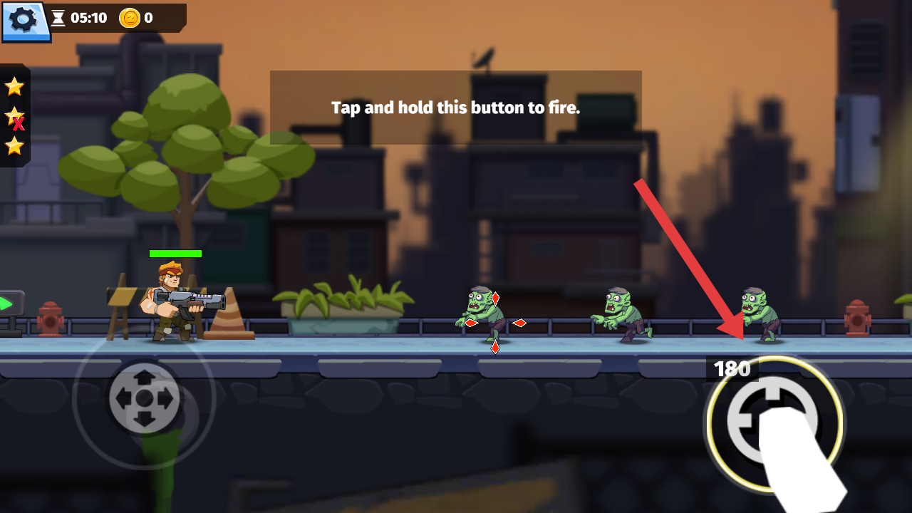 1、進(jìn)入戰(zhàn)斗后,可以連續(xù)點(diǎn)擊右下角射擊按鍵,持續(xù)攻擊逼近的僵尸,清除前方敵人,保障安全前進(jìn)。