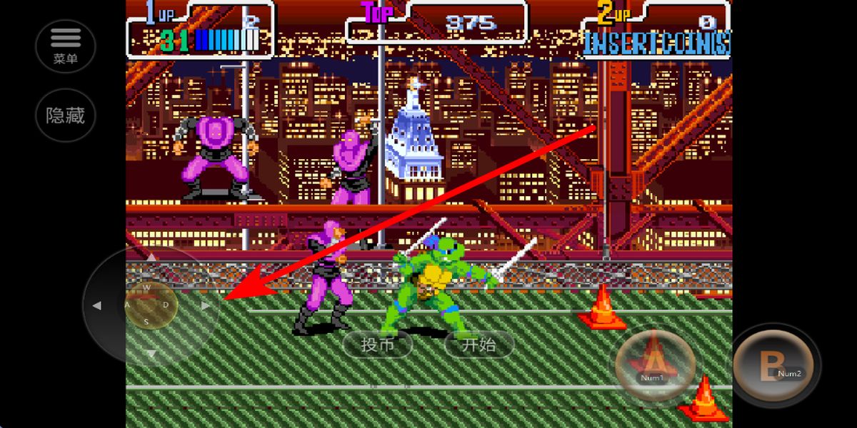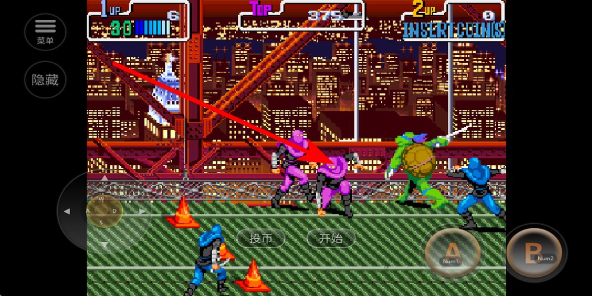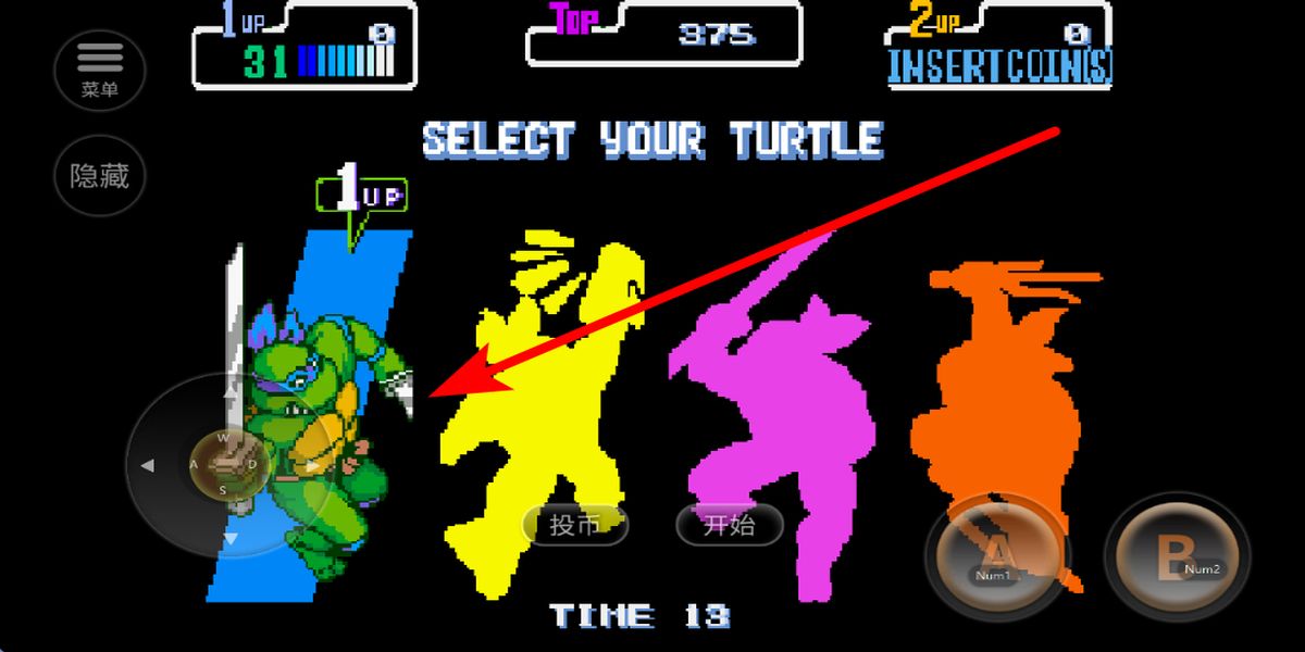 1、啟動(dòng)選擇角色:安裝完成后點(diǎn)擊投幣按鈕,再開(kāi)始游戲進(jìn)入角色選擇界面,挑選心儀的忍者龜角色,開(kāi)啟打擊邪惡犯罪的闖關(guān)之旅。