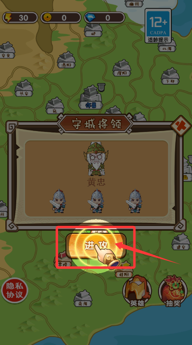 4、進入戰(zhàn)役地圖,選擇標(biāo)記"守城將領(lǐng)"的關(guān)卡,點擊出征指令發(fā)起進攻。