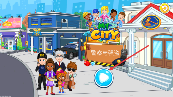 1、點(diǎn)擊主界面播放鍵,進(jìn)入城市場景,開啟警察抓強(qiáng)盜互動劇情,可探索警局、街道等區(qū)域,觸發(fā)初始任務(wù)。