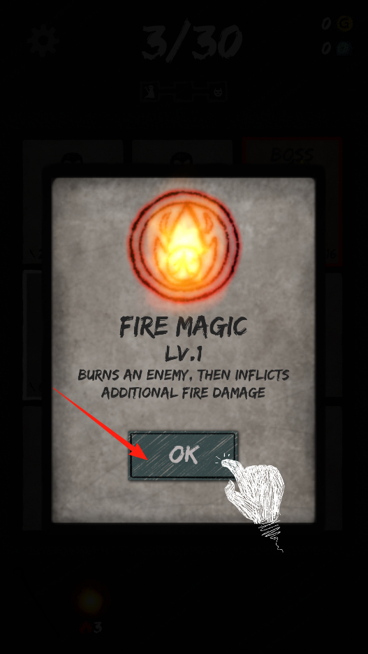2、進(jìn)入選魔法界面,有三個(gè)不同魔法卷軸,按照提示選左邊火焰魔法,確定后帶著這個(gè)魔法進(jìn)入戰(zhàn)斗,用它攻擊敵人。