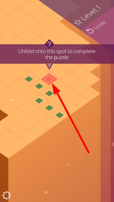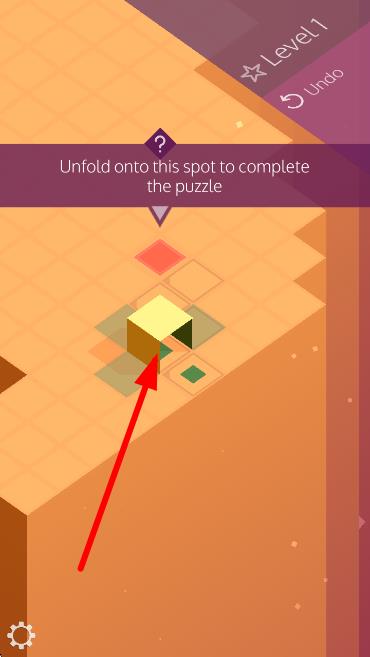 2、根據(jù)提示Unfold onto this spot to complete the puzzle,操作黃色方塊,按箭頭指引方向折疊,匹配目標位置。