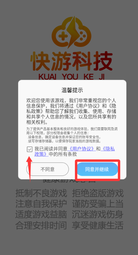 1、點擊溫馨提示里的同意并繼續(xù)進入游戲。