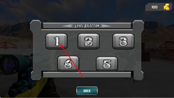 2、在關(guān)卡選擇界面,選擇關(guān)卡1,點擊進入,通過屏幕左下角的虛擬搖桿控制角色移動,利用屏幕右側(cè)的瞄準和射擊按鈕對敵人進行攻擊。