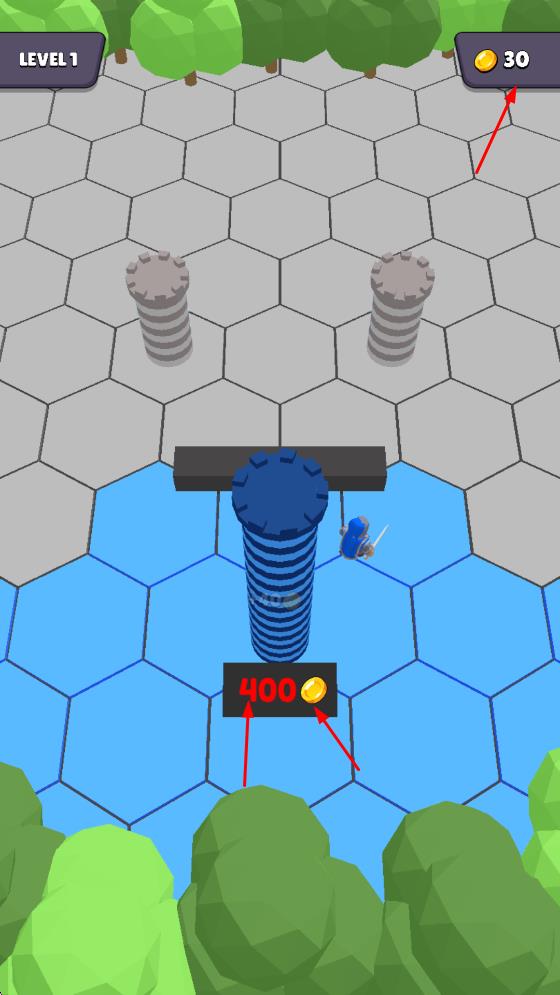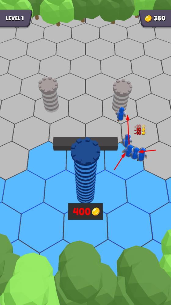 1、操控藍(lán)色騎士小兵在六邊形網(wǎng)格地圖移動,留意右上角初始金幣數(shù)量,目標(biāo)是收集地圖中柱子下方標(biāo)注的400金幣獎勵,為后續(xù)進(jìn)程積累資源。