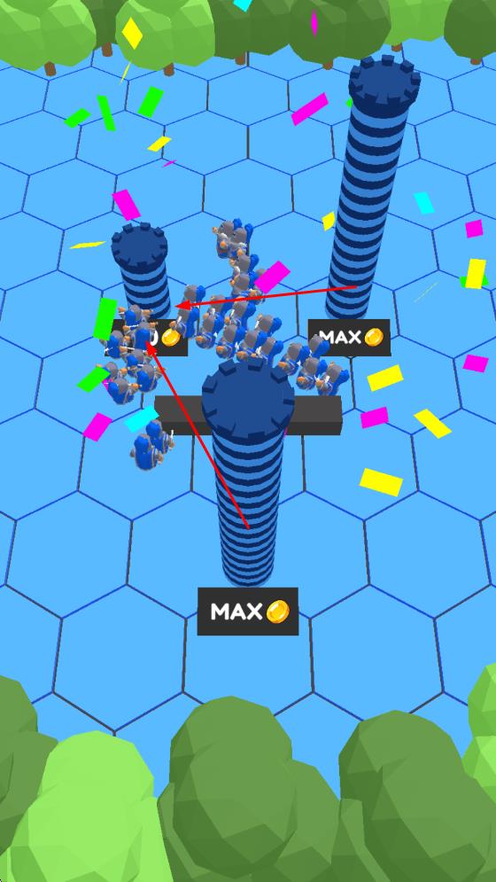 3、當(dāng)金幣收集達(dá)到MAX狀態(tài)時,完成關(guān)卡挑戰(zhàn),觸發(fā)彩色紙屑慶祝效果,獲取最終獎勵,用于解鎖后續(xù)關(guān)卡或提升小兵能力,豐富游戲體驗(yàn)。