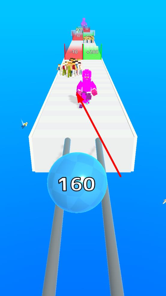 2、體積增大后,撞擊沿途人群和紫色敵人,遇到只有兩根管道通過的地方,提前減速微調(diào)方向,避免滾出跑道。