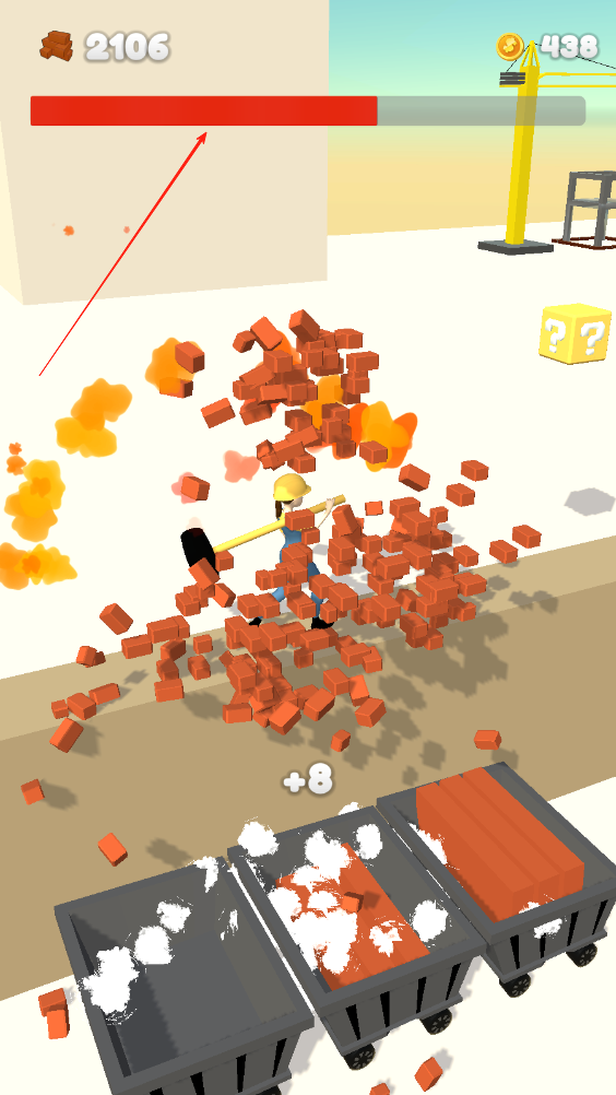 1、長按即可操縱小姐姐揮動(dòng)手中的鐵錘擊打空中的磚塊,磚塊會(huì)收集到旁邊的礦車?yán)铩?