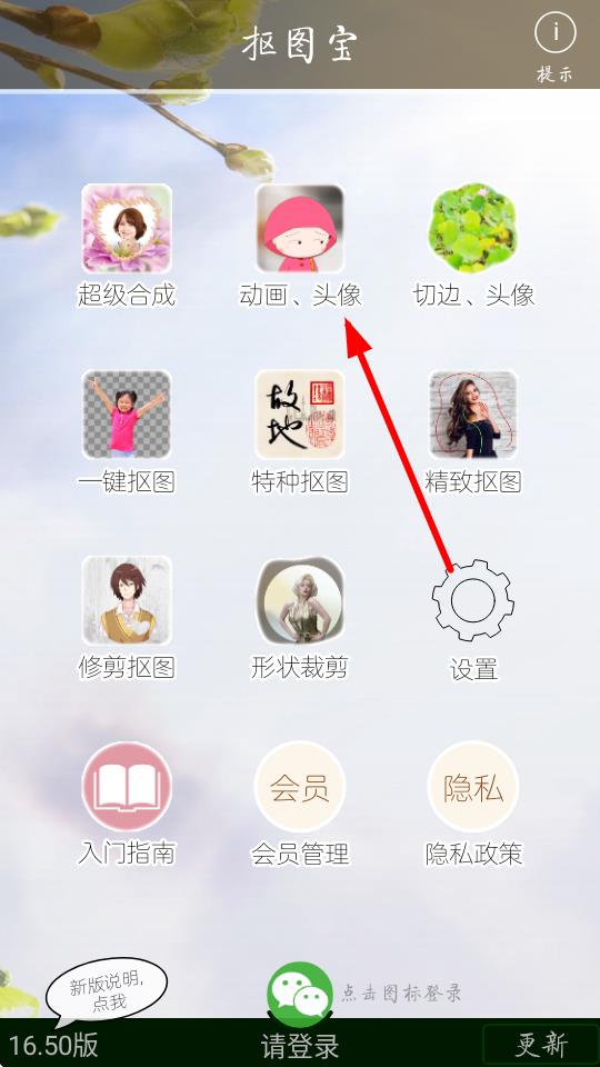 1、打開摳圖寶應(yīng)用,點(diǎn)擊動畫、頭像進(jìn)入制作界面。