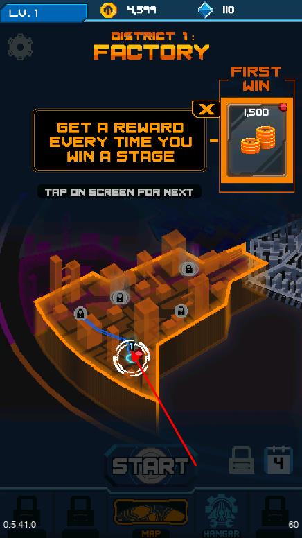 1、進(jìn)入游戲,在關(guān)卡選擇界面,選擇可進(jìn)入的區(qū)域,點(diǎn)擊START按鈕,在場景中,通過下方的虛擬操作按鈕,控制飛機(jī)的移動方向。