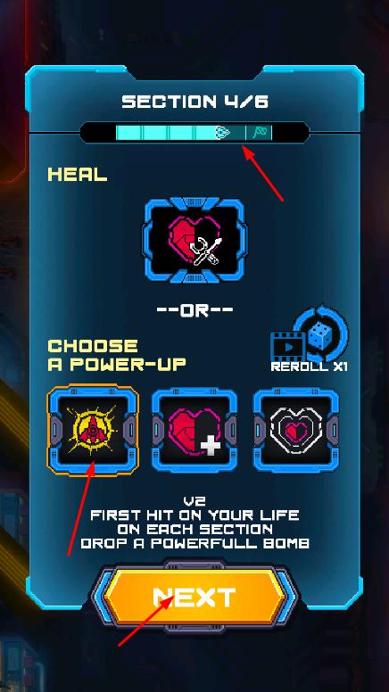 3、在關(guān)卡之間的界面,根據(jù)提示,選擇治療或選擇增強(qiáng)道具,點(diǎn)擊NEXT按鈕,進(jìn)入下一個區(qū)域。