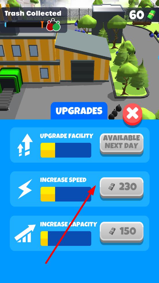 3、升級容量的話收集垃圾數(shù)量增多,升級速度的話就是效率變高,也可以觀看廣告,獲得更多收益,直接升級垃圾車。