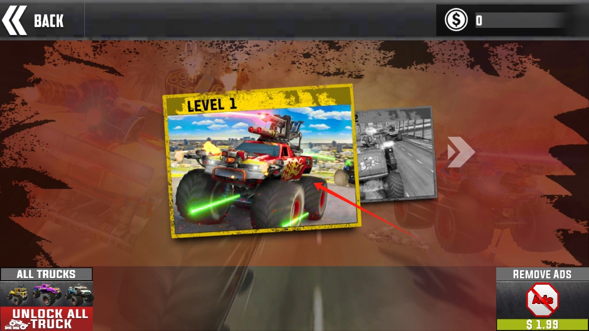 2、在關卡選擇界面,選LEVEL-1關卡 ,之后也可以使用金幣或付費解鎖更多車輛,增強游戲體驗。