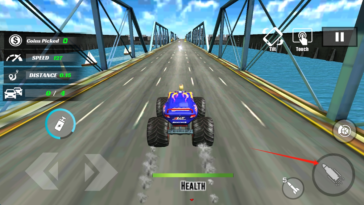 3、在游戲操作界面,根據個人習慣選擇傾斜或觸摸操作來控制車輛方向,收集路上的金幣,點擊射擊。