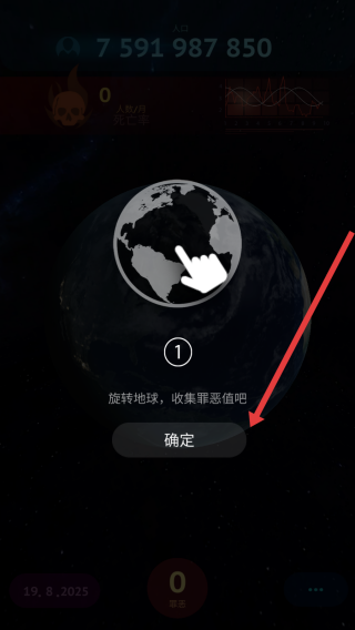 3、進(jìn)入神秘場景后,通過點(diǎn)擊確定按鈕,按提示旋轉(zhuǎn)地球模型,收集罪惡值,解鎖后續(xù)游戲玩法與劇情。