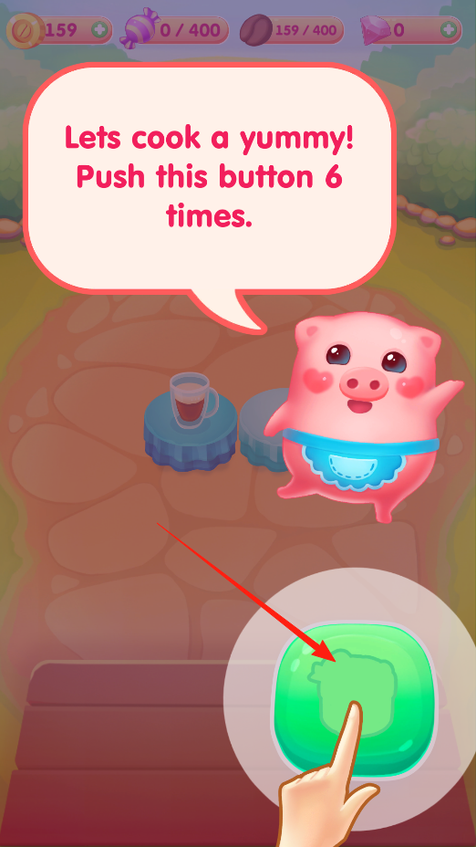 1、小豬說(shuō)咱們做道美味的菜吧,按這個(gè)按鈕6次,那就點(diǎn)綠色按鈕,一下一下按夠6次,每按一次,應(yīng)該是在制作美食的步驟里推進(jìn),按完6次,就能完成這輪烹飪準(zhǔn)備。