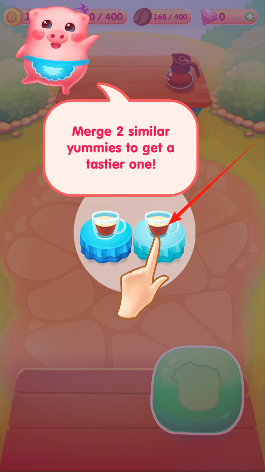 2、提示合并兩個(gè)相似的美味食物,就能得到更美味的一個(gè),找到兩個(gè)一樣的美食,把它們拖到一起合并,這樣能解鎖新的更好吃的料理,繼續(xù)擴(kuò)展美食種類。