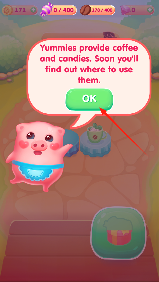 3、小豬講美味食品公司提供咖啡和糖果,很快你就會(huì)知道在哪里可以享用它們,點(diǎn)OK按鈕確認(rèn),這是了解游戲機(jī)制的提示,知道美食能產(chǎn)出咖啡和糖果,點(diǎn)完繼續(xù)探索游戲玩法。
