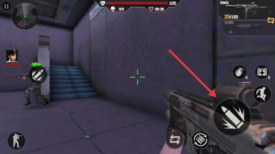 2、通過虛擬搖桿控制移動,滑動屏幕調(diào)整射擊準星,點擊開火鍵攻擊目標。