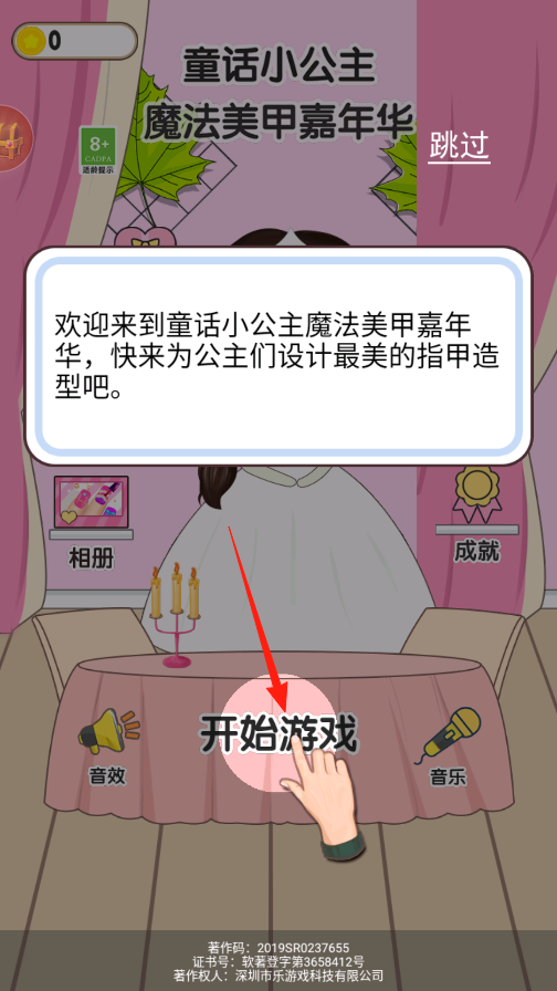 1、進(jìn)入游戲主界面,點(diǎn)開始游戲按鈕,這就開啟美甲創(chuàng)作之旅,要給公主設(shè)計指甲造型,從選指甲、涂甲油到裝飾,一步步打造獨(dú)特美甲。