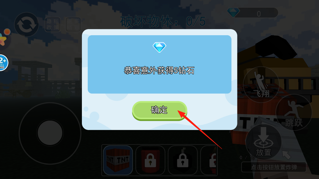 1、彈出意外獲得5鉆石的提示框,點(diǎn)確定收下鉆石,這些鉆石能在商店買道具,接著繼續(xù)游戲,去完成破壞物體的任務(wù),用鉆石助力闖關(guān)。
