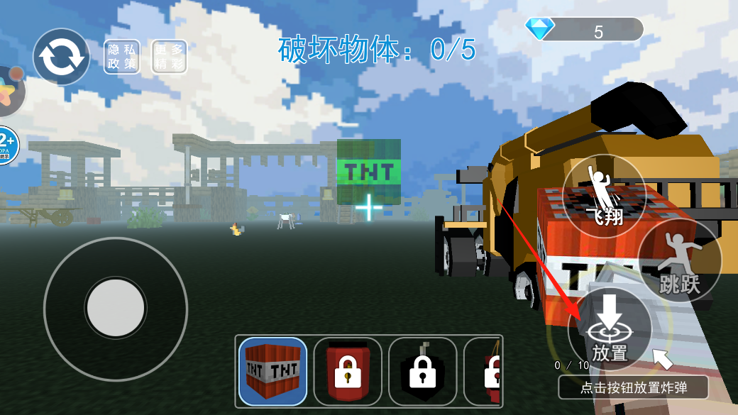 2、選好TNT炸彈道具,點(diǎn)右側(cè)放置按鈕,把炸彈放地上,放好后,找要破壞的物體,等炸彈爆炸,完成破壞目標(biāo),推進(jìn)關(guān)卡進(jìn)度。