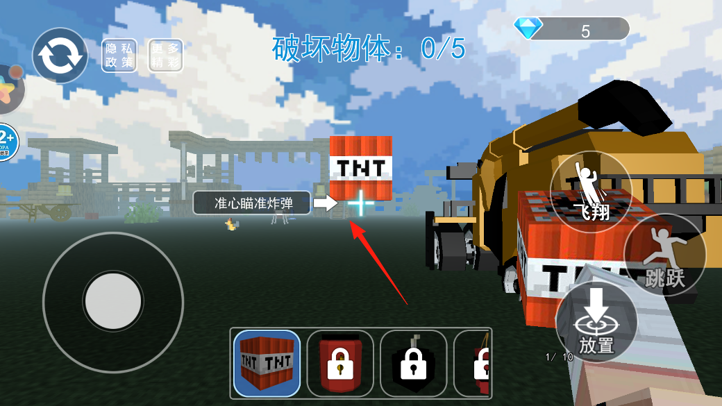 3、放置TNT后,準(zhǔn)心對(duì)準(zhǔn)空中TNT炸彈,點(diǎn)攻擊或者引爆按鈕,讓炸彈連鎖爆炸,靠這招破壞場(chǎng)景里的物體,完成破壞物體任務(wù),看看能炸掉多少目標(biāo)。